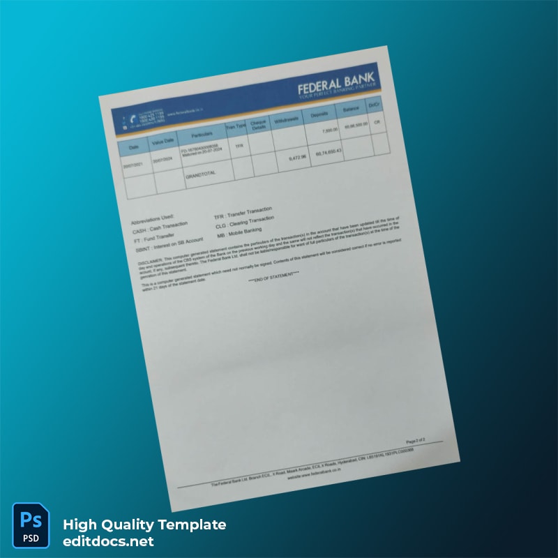 India Federal Bank Bank Statement Template in Word and PDF formats 2 page