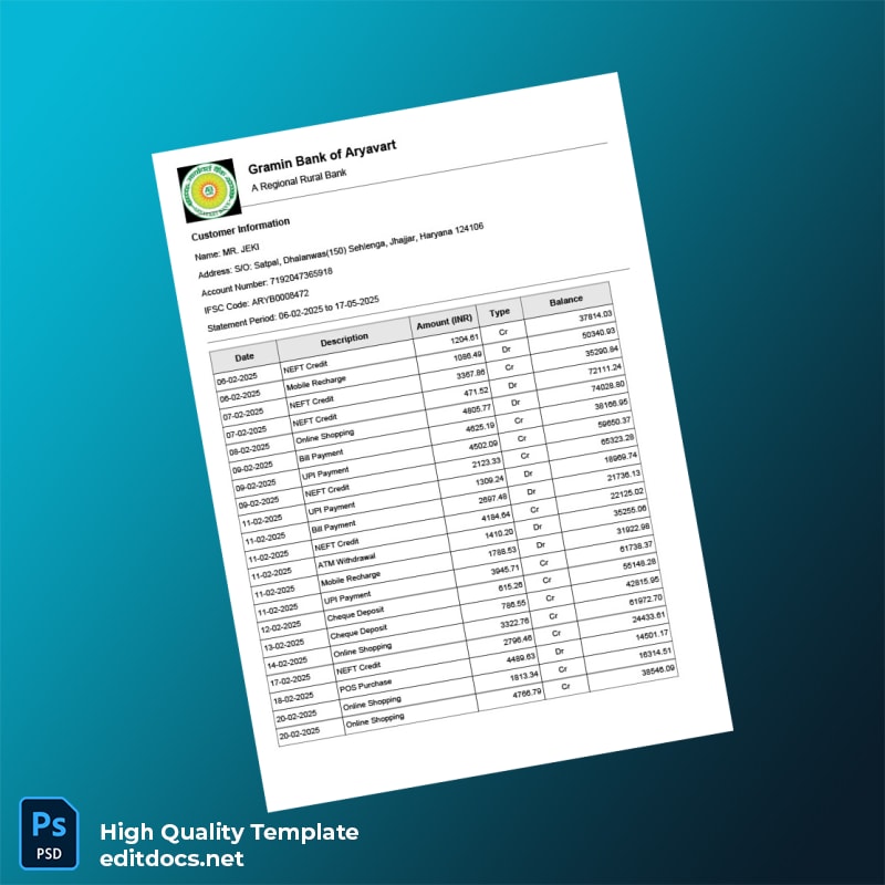 Don’t wait any longer to regain control over your financial documentation. Invest in the India Gramin Bank of Aryavart Bank Statement Template today. It’s time to streamline your financial processes and enhance your professional image. For more related templates, explore our offerings in editable bank statement templates or check out our options for quarterly bank statement templates like the 3 months bank statement PDF and 6 months bank statement PDF.